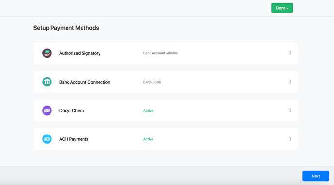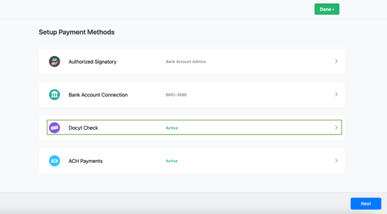 - Now, you have added your signature to Docyt. Click "Setup Payment Methods" in the left pane to activate individual services such as Docyt Full Service Check and Docyt ACH.